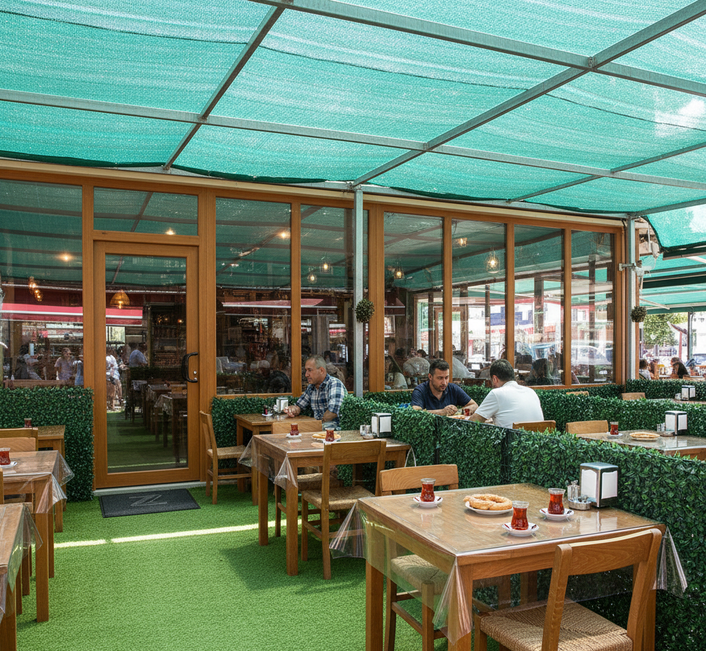 Kafe, teras ve bekleme alanlarında güneşi dengeler; serin, kullanışlı ve estetik oturumlar sağlar.