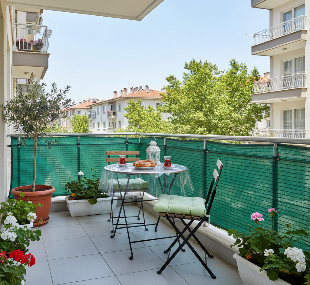 Ceyto Yapı, balkon ve teraslarınızı daha konforlu, güvenli ve estetik hale getirmek için özel gölgelik çözümleri sunar. Korkuluk boyunda uygulanan UV-stabil gölgelik file, güneş ışığını dengelerken aynı zamanda mahremiyet ve ferahlık sağlar.